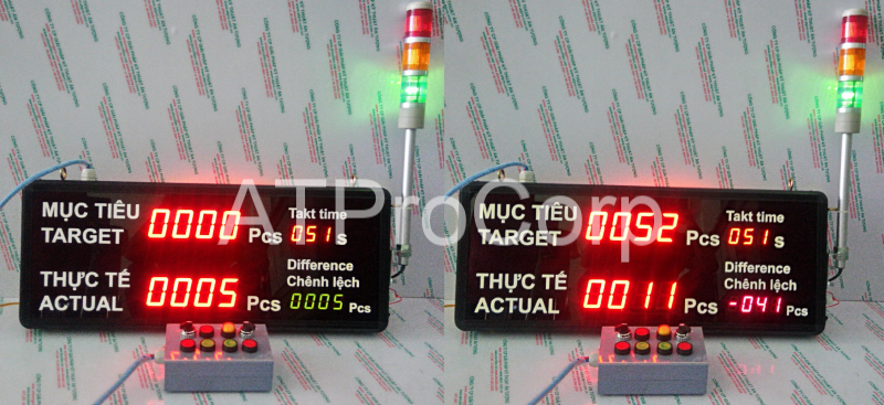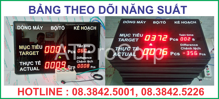 Bảng theo dõi năng suất có kích thước : 750mm x 450mm x 50mm. Số hiển thị lớn bằng LED 7 đoạn KT 50 x 70mm. Số hiển thị nhỏ bằng LED 7 đoạn KT 30 x 40mm. Có 2 cụm đèn vàng và đèn đỏ. Khi thực tế bằng hoặc cao hơn mục tiêu cụm đèn vàng sẽ sáng, khi thực tế thấp hơn mục tiêu cụm đèn đỏ sẽ sáng.